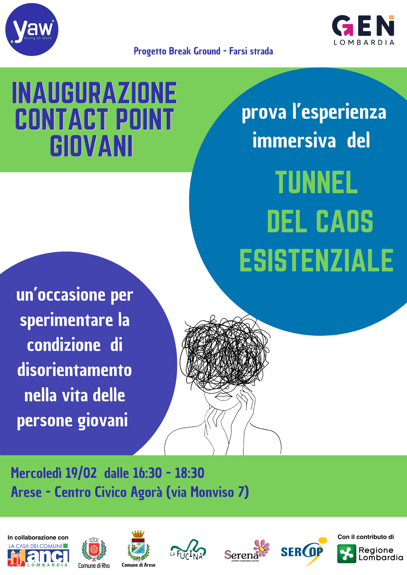 Break Ground – Farsi strada, è finanziato da Regione Lombardia e realizzato in collaborazione con ANCI Lombardia. Il progetto è sviluppato in co-progettazione da SER.CO.P. – Azienda Speciale per i Servizi alla Persona dei Comuni del Rhodense, Cooperativa La Fucina, Cooperativa Serena, Comune di Arese e Comune di Rho. Trovate gli altri due Contact Point al MAST di Rho e a Palazzo Granaio di Settimo Milanese.