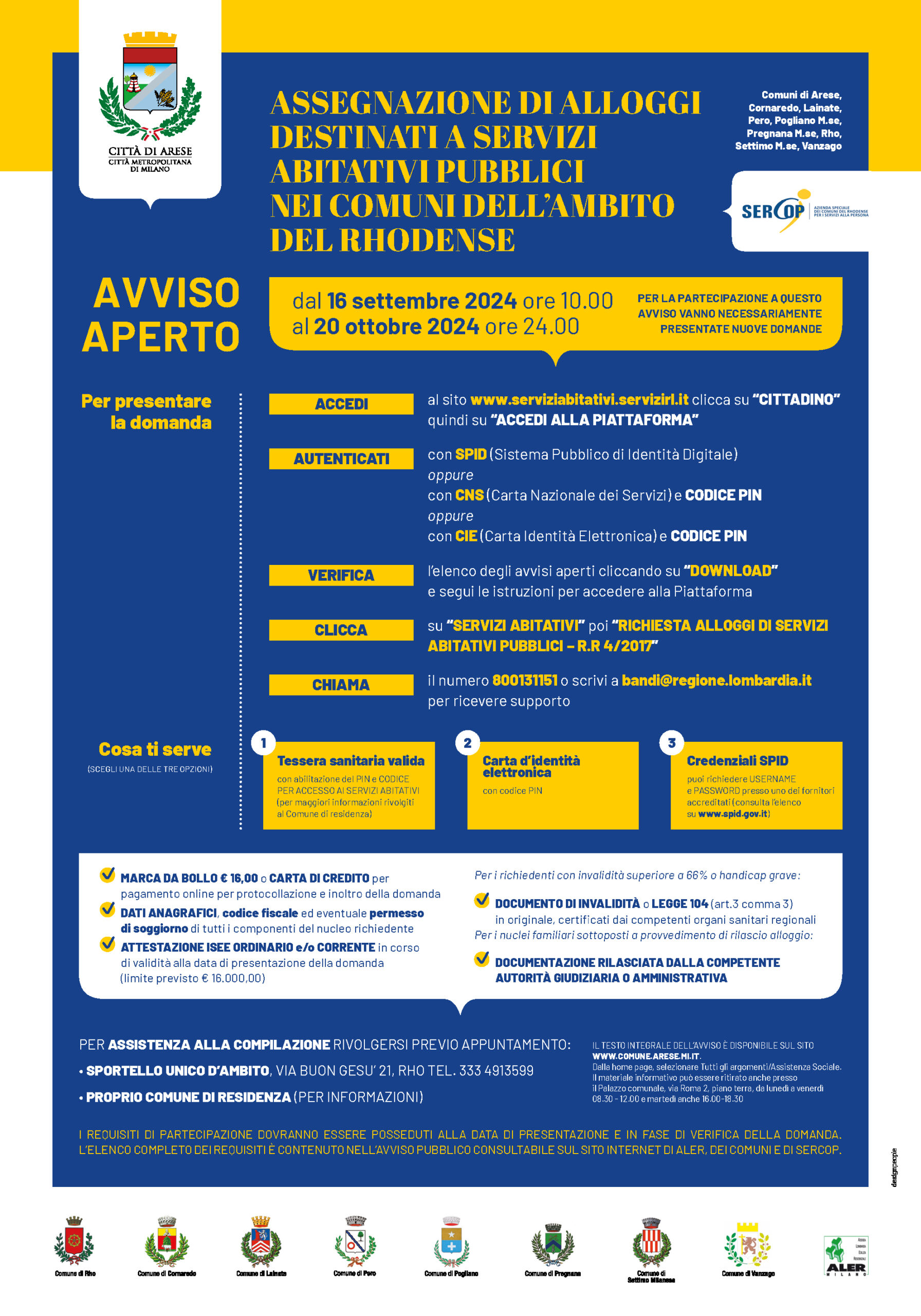 Dal 16 settembre alle ore 10.00 al 20 ottobre 2024 alle ore 24.00 è aperto il nuovo AVVISO per assegnare in affitto le case dei Servizi Abitativi Pubblici, ex “case popolari”, nell’ambito territoriale del RHODENSE.