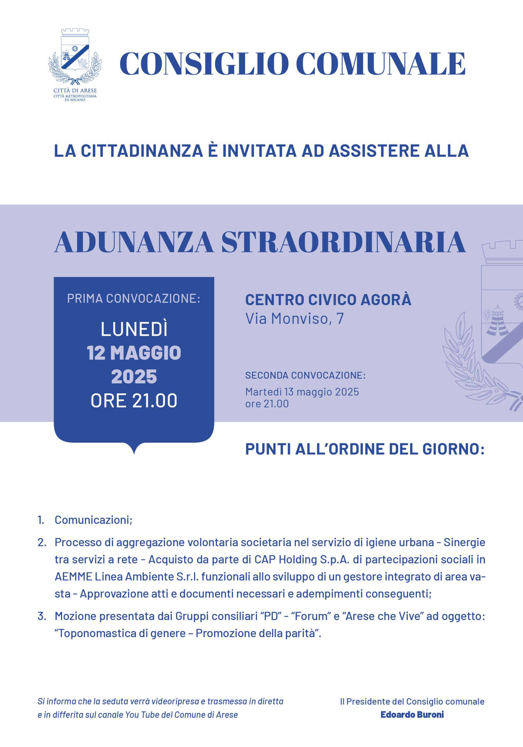 La prossima seduta del Consiglio comunale in adunanza straordinaria si terrà in prima convocazione lunedì 12 maggio 2025 alle 21.00 presso il Centro civico Agorà, via Monviso 7 (e, se necessario, in seconda convocazione martedì 13 maggio 2025 alle 21.00).