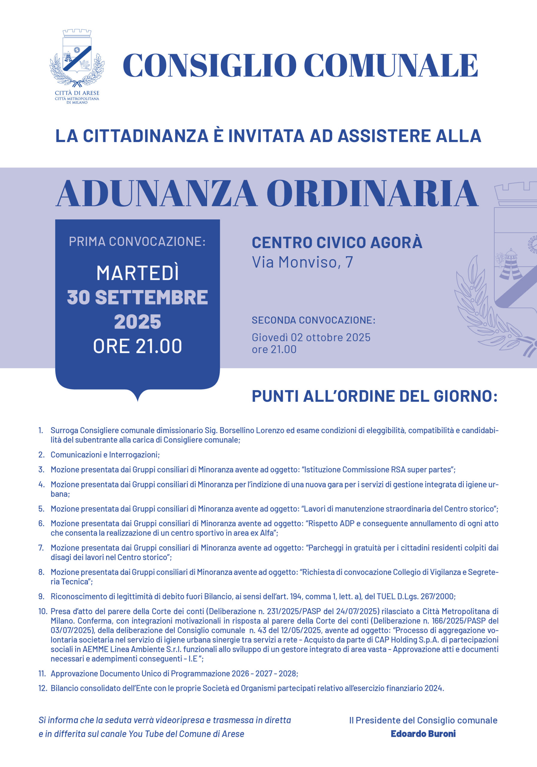 La prossima seduta del Consiglio comunale in adunanza ordinaria si terrà in prima convocazione martedì 30 settembre 2025 alle 21.00 presso il Centro civico Agorà, via Monviso 7 (e, se necessario, in seconda convocazione giovedì 2 ottobre 2025 alle 21.00).