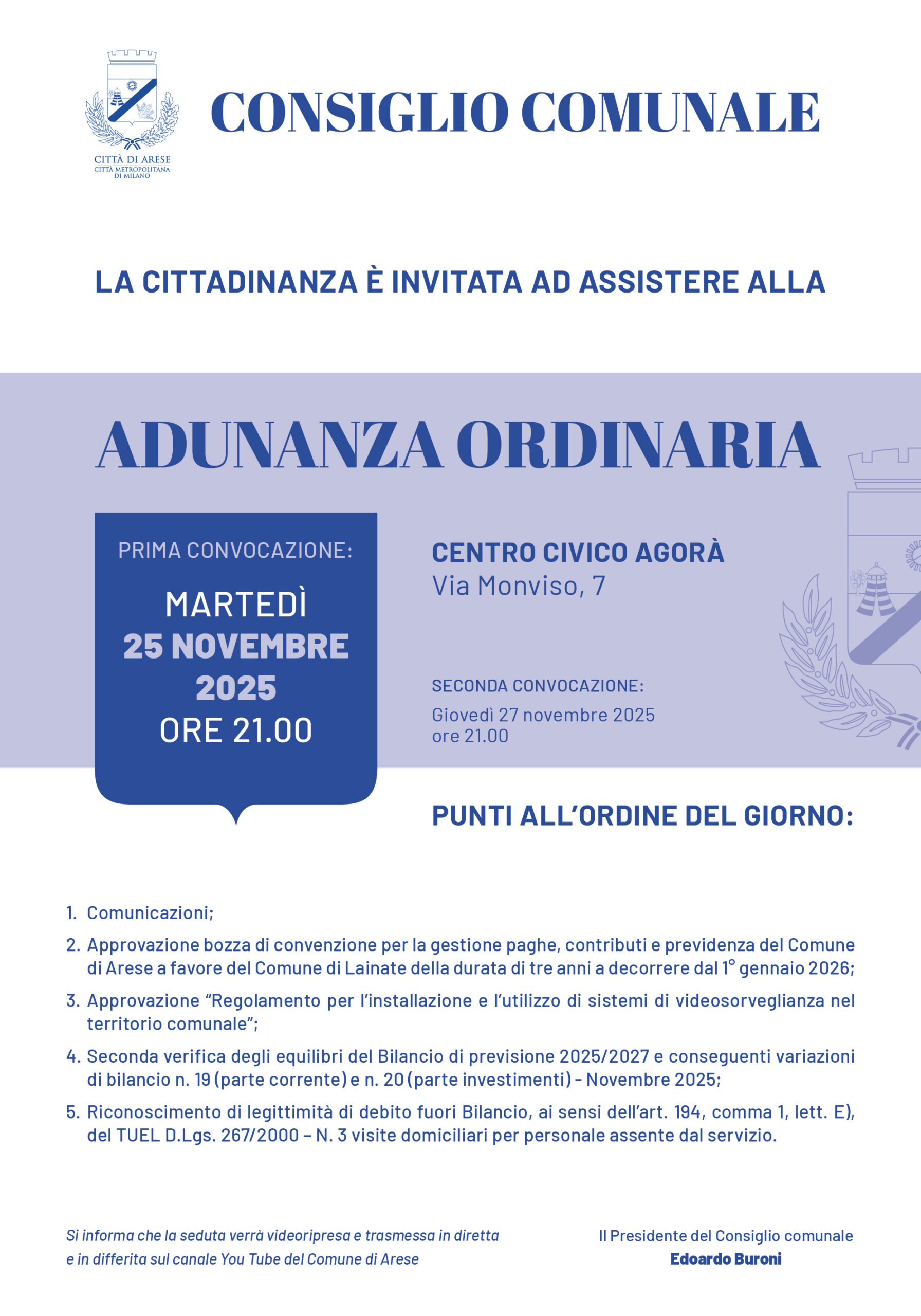 La seduta verrà videoripresa. Il regolamento che disciplina la videoripresa delle sedute del Consiglio Comunale èdisponibile qui.