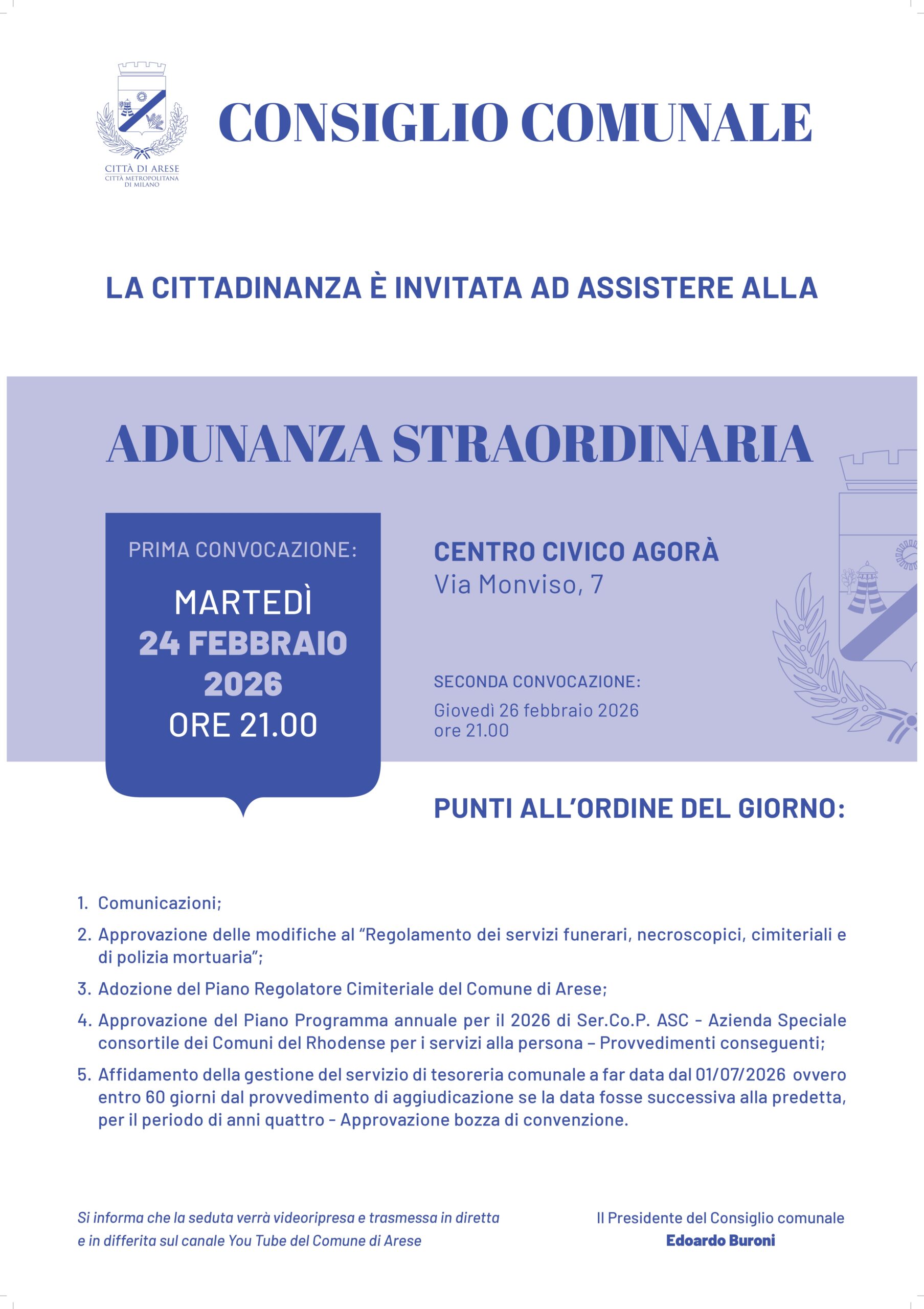 La prossima seduta del Consiglio comunale in adunanza straordinaria si terrà in prima convocazione martedì 24 febbraio 2026 alle 21.00 presso il Centro civico Agorà, via Monviso 7 (e, se necessario, in seconda convocazione giovedì 26 febbraio 2026 alle 21.00).