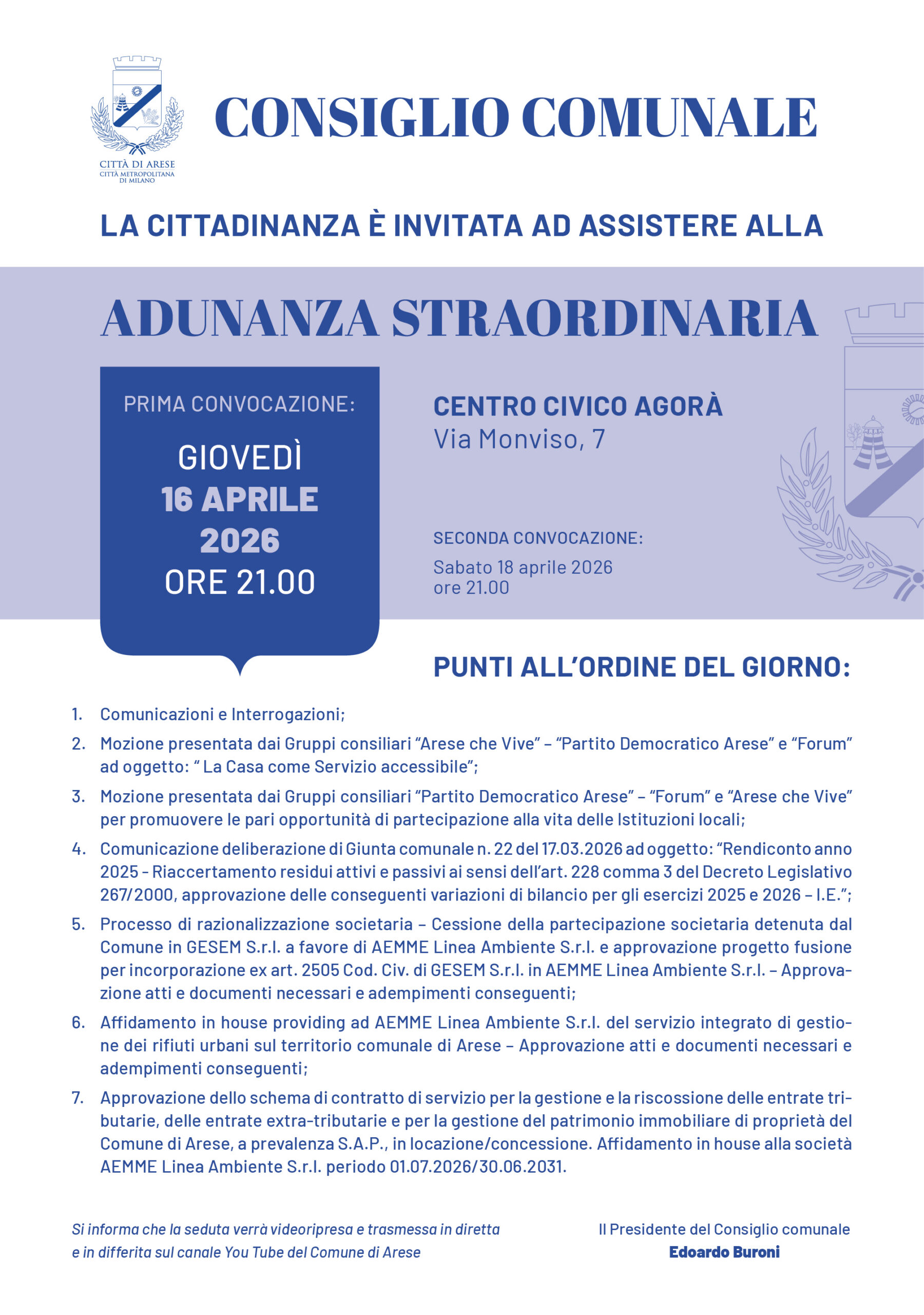 La prossima seduta del Consiglio comunale in adunanza straordinaria si terrà in prima convocazione giovedì 16 aprile 2026 alle 21.00 presso il Centro civico Agorà, via Monviso 7 (e, se necessario, in seconda convocazione sabato 18 aprile 2026 alle 21.00).