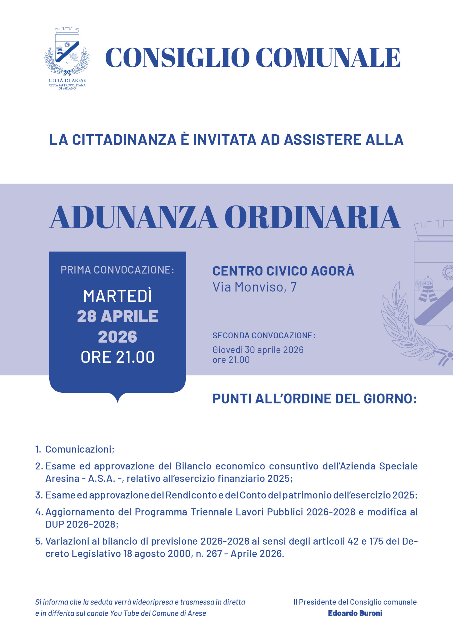 La prossima seduta del Consiglio comunale in adunanza ordinaria si terrà in prima convocazione martedì 28 aprile 2026 alle 21.00 presso il Centro civico Agorà, via Monviso 7 (e, se necessario, in seconda convocazione giovedì 30 aprile 2026 alle 21.00).