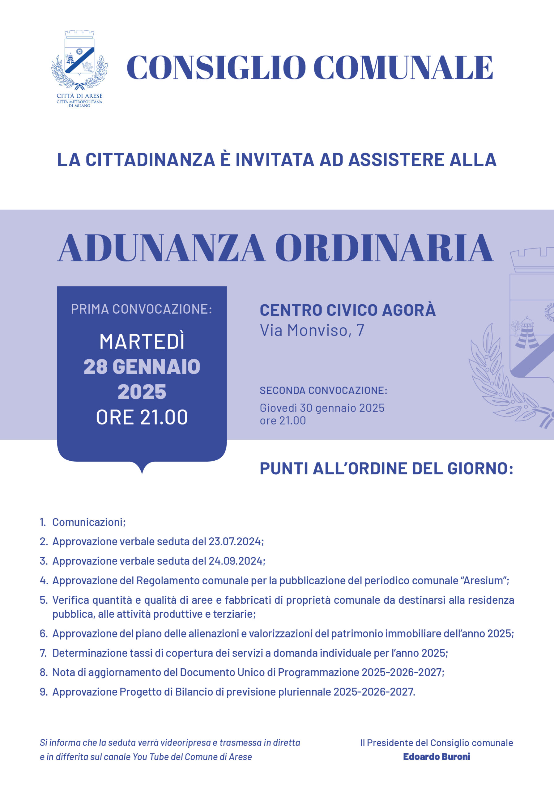 La seduta verrà videoripresa. Il regolamento che disciplina la videoripresa delle sedute del Consiglio Comunale è disponibile qui.