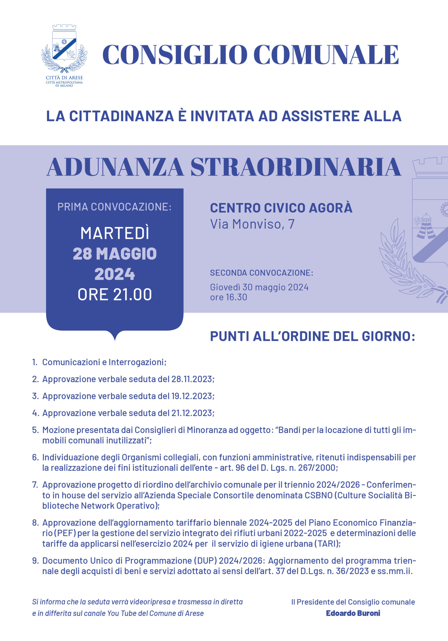 La prossima seduta del Consiglio comunale in adunanza straordinaria si terrà in prima convocazione martedì 28 maggio 2024 alle 21.00 presso il Centro civico Agorà, via Monviso 7 (e, se necessario, in seconda convocazione giovedì 30 maggio 2024 alle 16:30).
