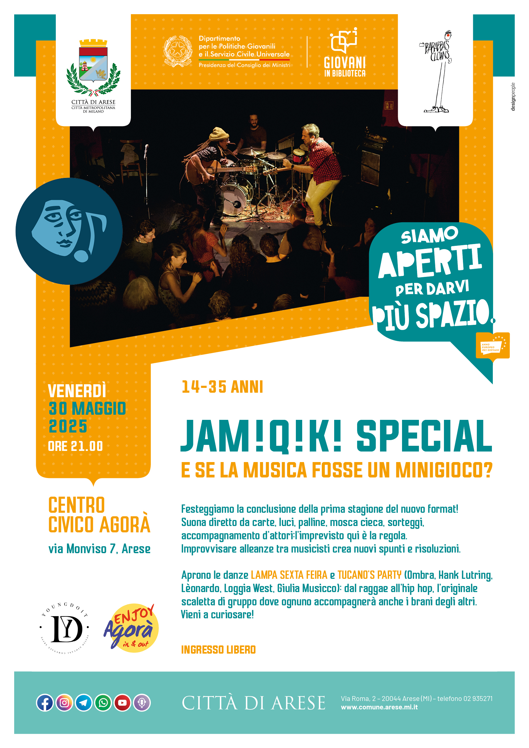 L’iniziativa è organizzata in collaborazione con i 𝐁𝐚𝐫𝐚𝐛𝐛𝐚’𝐬 𝐂𝐥𝐨𝐰𝐧𝐬 e lo Spazio Giovani 𝐘𝐨𝐮𝐧𝐠𝐃𝐨𝐈𝐭 e rientra tra le attività di 𝐄𝐧𝐣𝐨𝐲 𝐀𝐠𝐨𝐫𝐚̀ – 𝐈𝐧 & 𝐨𝐮𝐭, tra i progetti vincitori dell’𝐴𝑣𝑣𝑖𝑠𝑜 𝑝𝑢𝑏𝑏𝑙𝑖𝑐𝑜 𝑑𝑒𝑙 𝐷𝑖𝑝𝑎𝑟𝑡𝑖𝑚𝑒𝑛𝑡𝑜 𝑝𝑒𝑟 𝑙𝑒 𝑃𝑜𝑙𝑖𝑡𝑖𝑐ℎ𝑒 𝐺𝑖𝑜𝑣𝑎𝑛𝑖𝑙𝑖 𝑒 𝑖𝑙 𝑠𝑒𝑟𝑣𝑖𝑧𝑖𝑜 𝑐𝑖𝑣𝑖𝑙𝑒 𝑢𝑛𝑖𝑣𝑒𝑟𝑠𝑎𝑙𝑒 𝑑𝑒𝑙𝑙𝑎 𝑃𝑟𝑒𝑠𝑖𝑑𝑒𝑛𝑧𝑎 𝑑𝑒𝑙 𝐶𝑜𝑛𝑠𝑖𝑔𝑙𝑖𝑜 𝑑𝑒𝑖 𝑚𝑖𝑛𝑖𝑠𝑡𝑟𝑖.