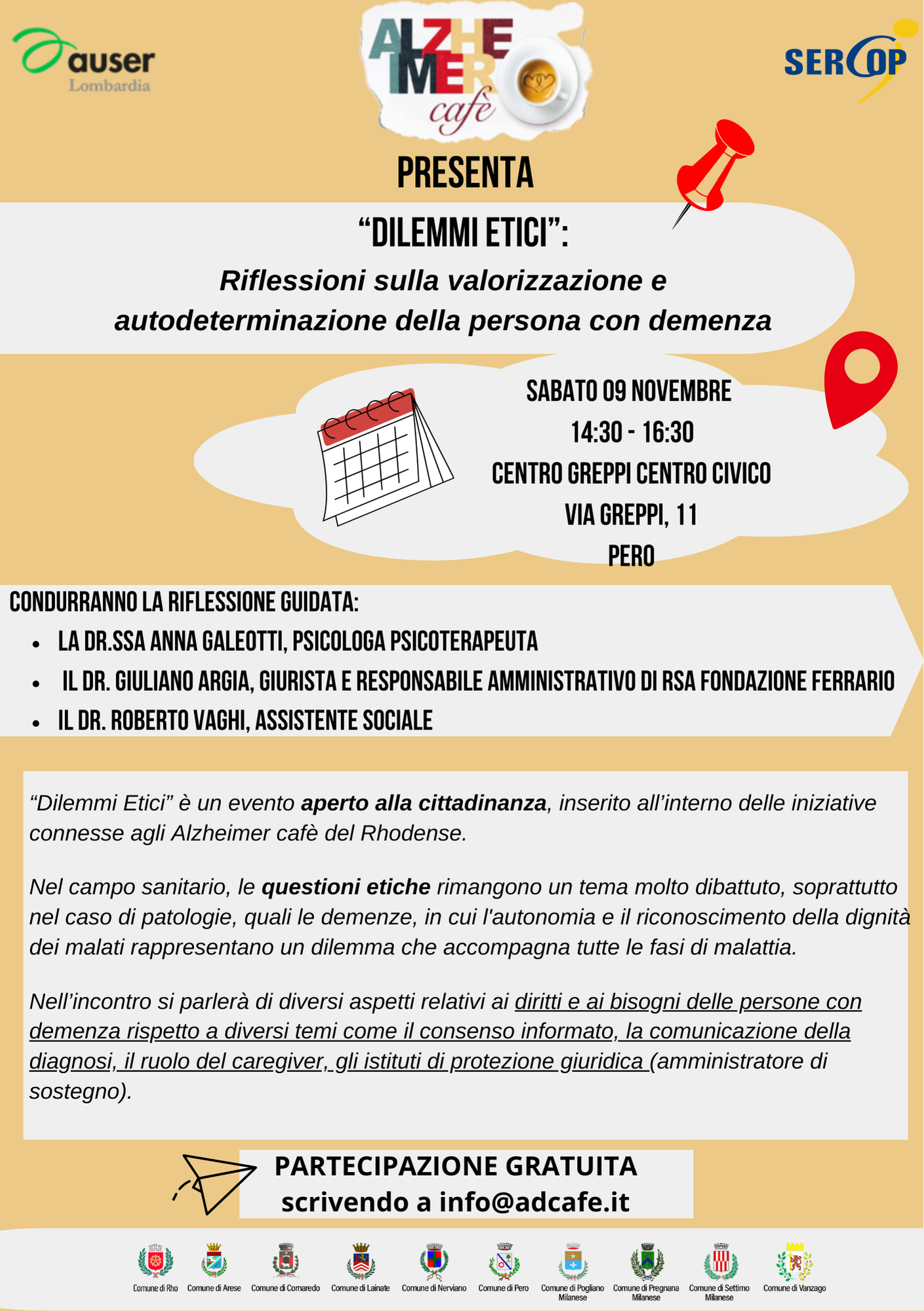 Interverranno la dott.ssa Anna Galeotti, psicologa psicoterapeuta, il dott. Giuliano Argia, giurista e responsabile amministrativo di RSA Fondazione Ferrario, il dott. Roberto Vaghi, assistente sociale.