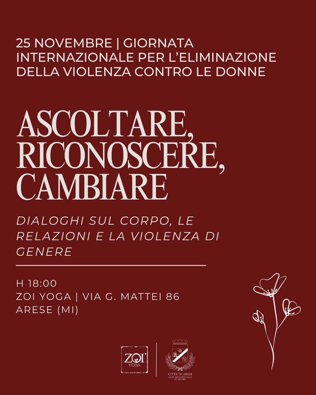In occasione della Giornata internazionale per l’eliminazione della violenza contro le donne, Zoi Yoga invita a un incontro gratuito, patrocinato dal Comune di Arese, per riflettere insieme su come la violenza di genere affondi le sue radici nella cultura, nei ruoli sociali e nelle relazioni quotidiane – e su come riconoscerne i segnali.