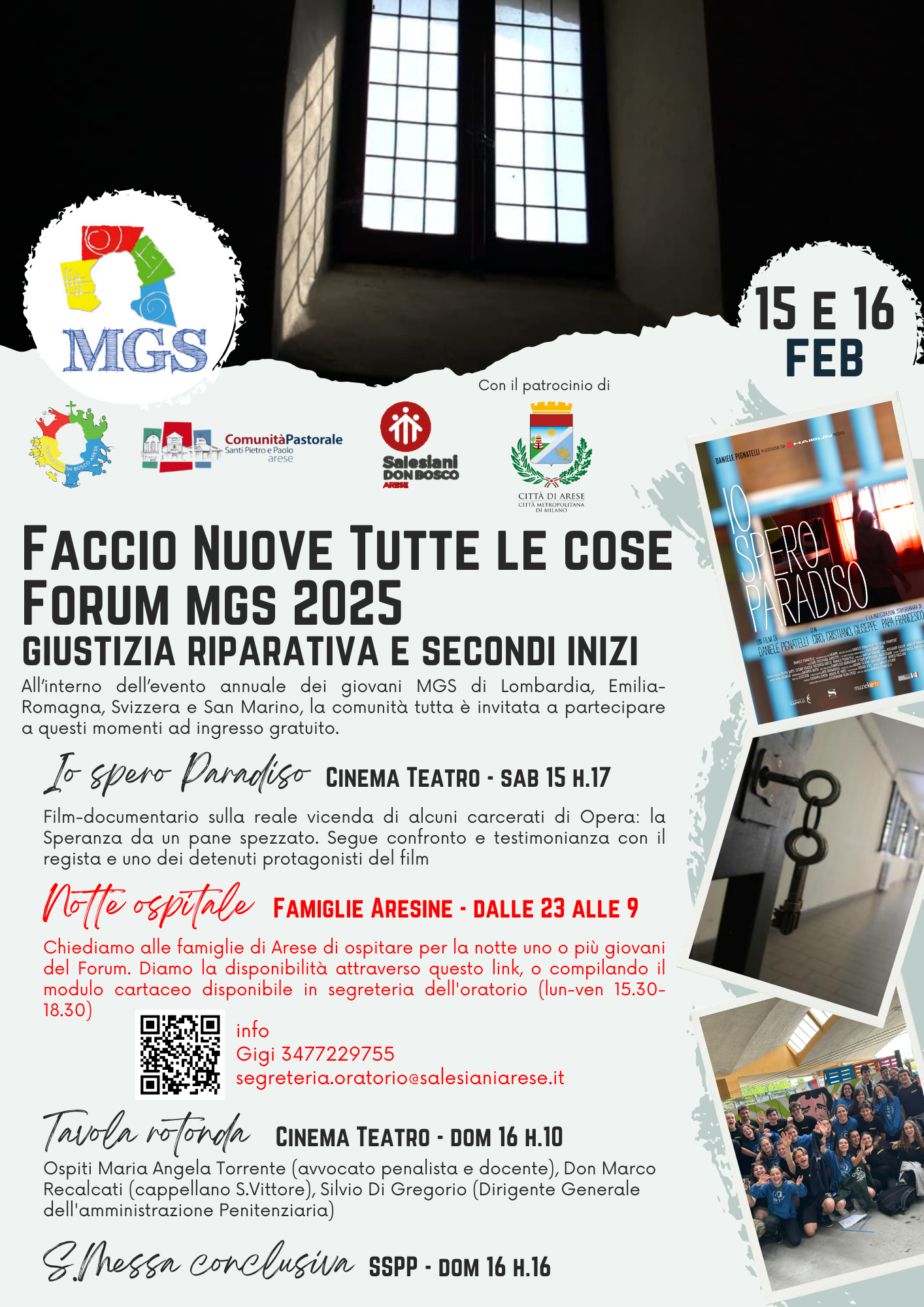 All’interno dell’evento annuale dei giovani “Movimento Giovanile Salesiani” (MGS) di Lombardia, Emilia Romagna, Svizzera e San Marino, la cittadinanza è invitata a partecipare ad alcuni momenti di riflessione e confronto sui temi della giustizia riparativa e secondi inizi. L’iniziativa è patrocinata dal Comune di Arese.