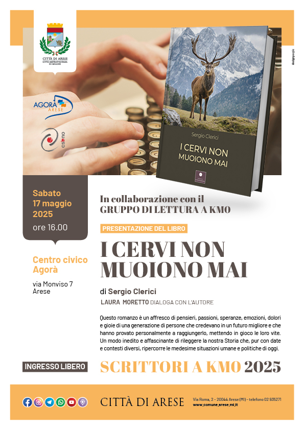 Sabato 17 maggio 2025, alle 16.00 all’Agorà, ci sarà la presentazione del libro “I cervi non muoiono mai” di Sergio Clerici.