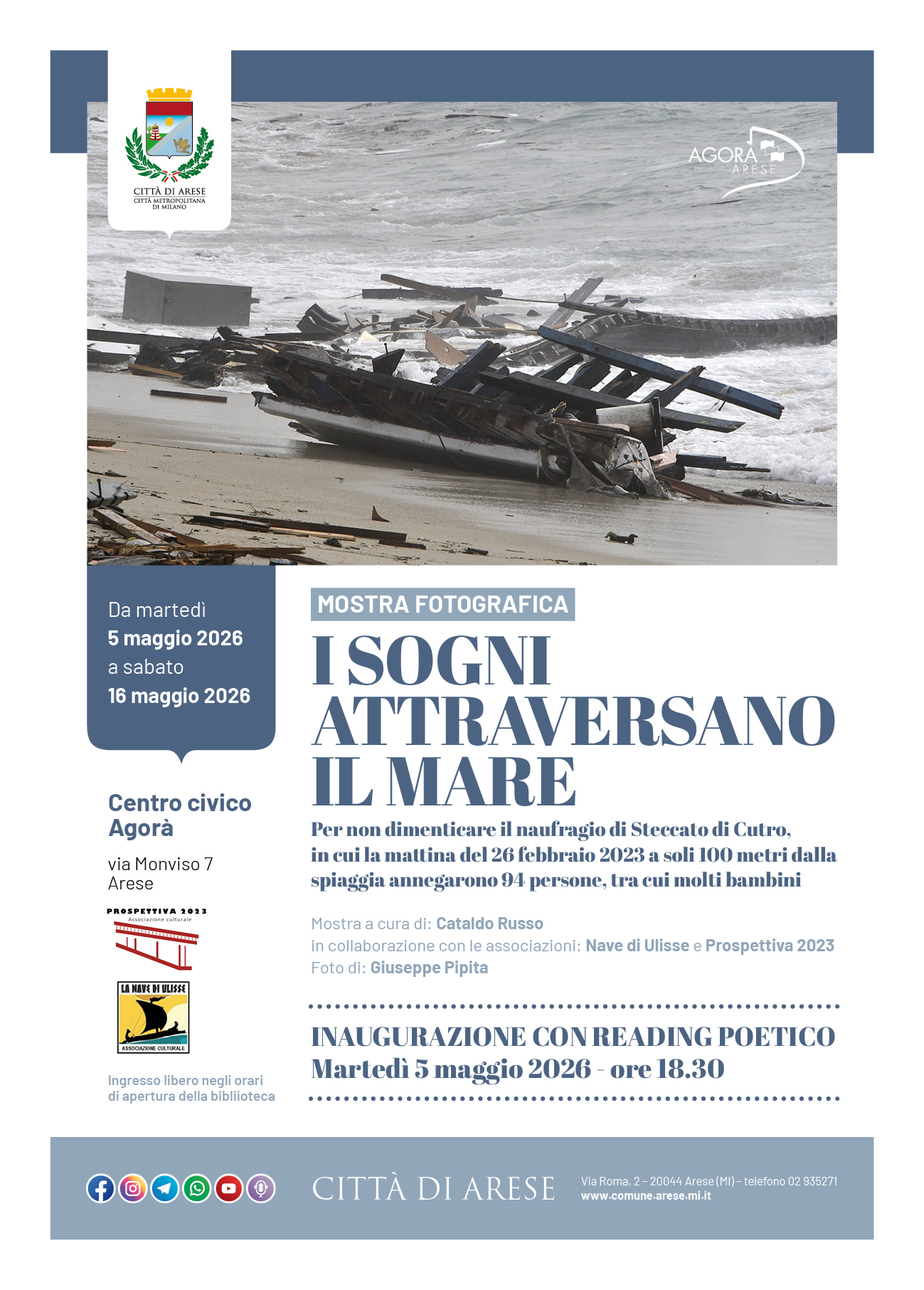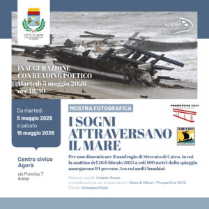 Da martedì 5 maggio a sabato 16 maggio 2026, l’Agorà ospita la mostra “I sogni attraversano il mare” – Per non dimenticare il naufragio di Steccato di Cutro, in cui la mattina del 26 febbraio 2023 a soli 100 metri dalla spiaggia annegarono 94 persone, tra cui molti bambini.