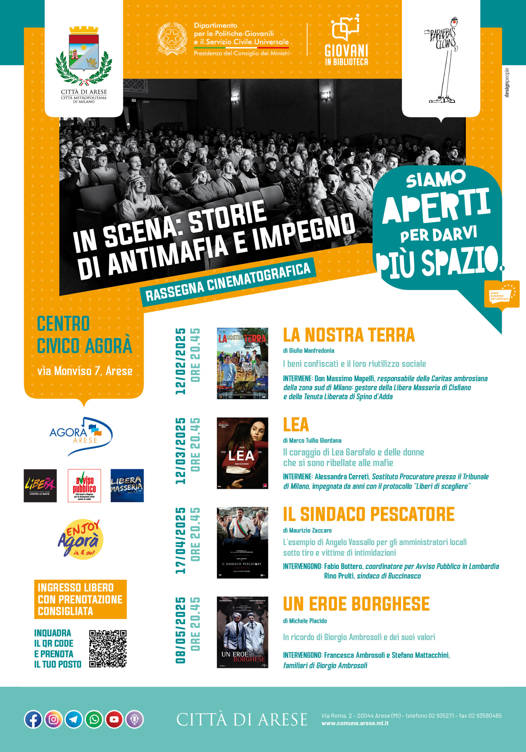La rassegna cinematografica, oltre alla partecipazione dei Barabba’s clown, partner del progetto Enjoy Agorà – In & out, è resa possibile anche grazie al coinvolgimento di Libera. Associazioni, nomi e numeri contro le mafie.