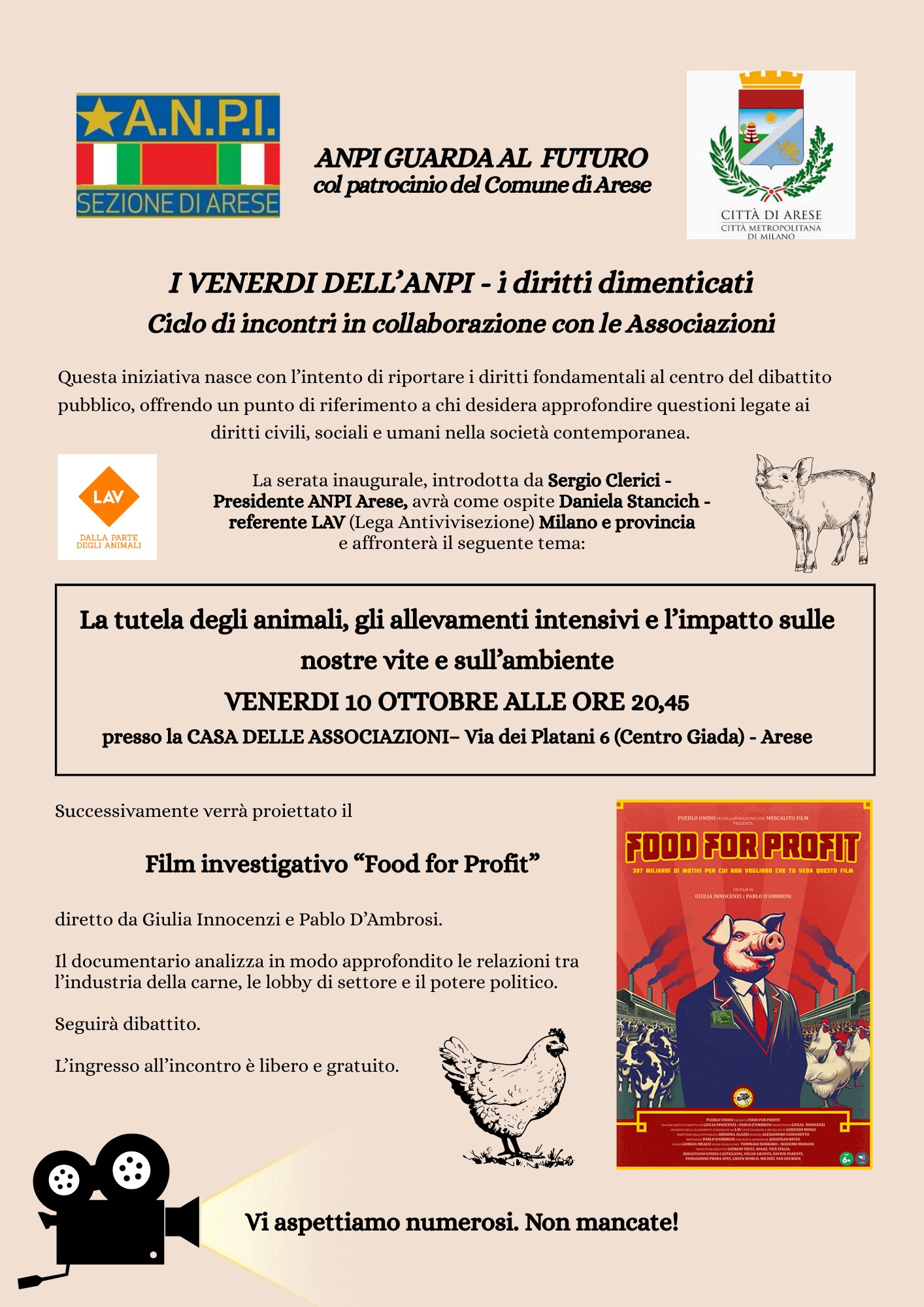 Venerdì 10 ottobre 2025, alle 20.45 alla Casa delle Associazioni, ci sarà una serata introdotta da Sergio Clerici, Presidente ANPI Arese, con la presenza di Daniela Stancich, referente LAV (Lega antivivisezione) Milano e provincia che affronterà il tema: La tutela degli animali, gli allevamenti intensivi e l’impatto sulle nostre vite e sull’ambiente