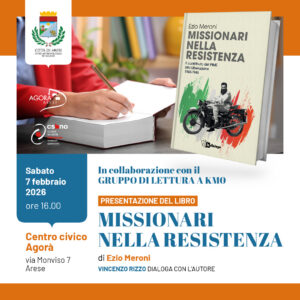Sabato 7 febbraio 2026 alle 16.00 al Centro civico Agorà, ci sarà la presentazione del libro Missionari nella Resistenza di Ezio Meroni.
