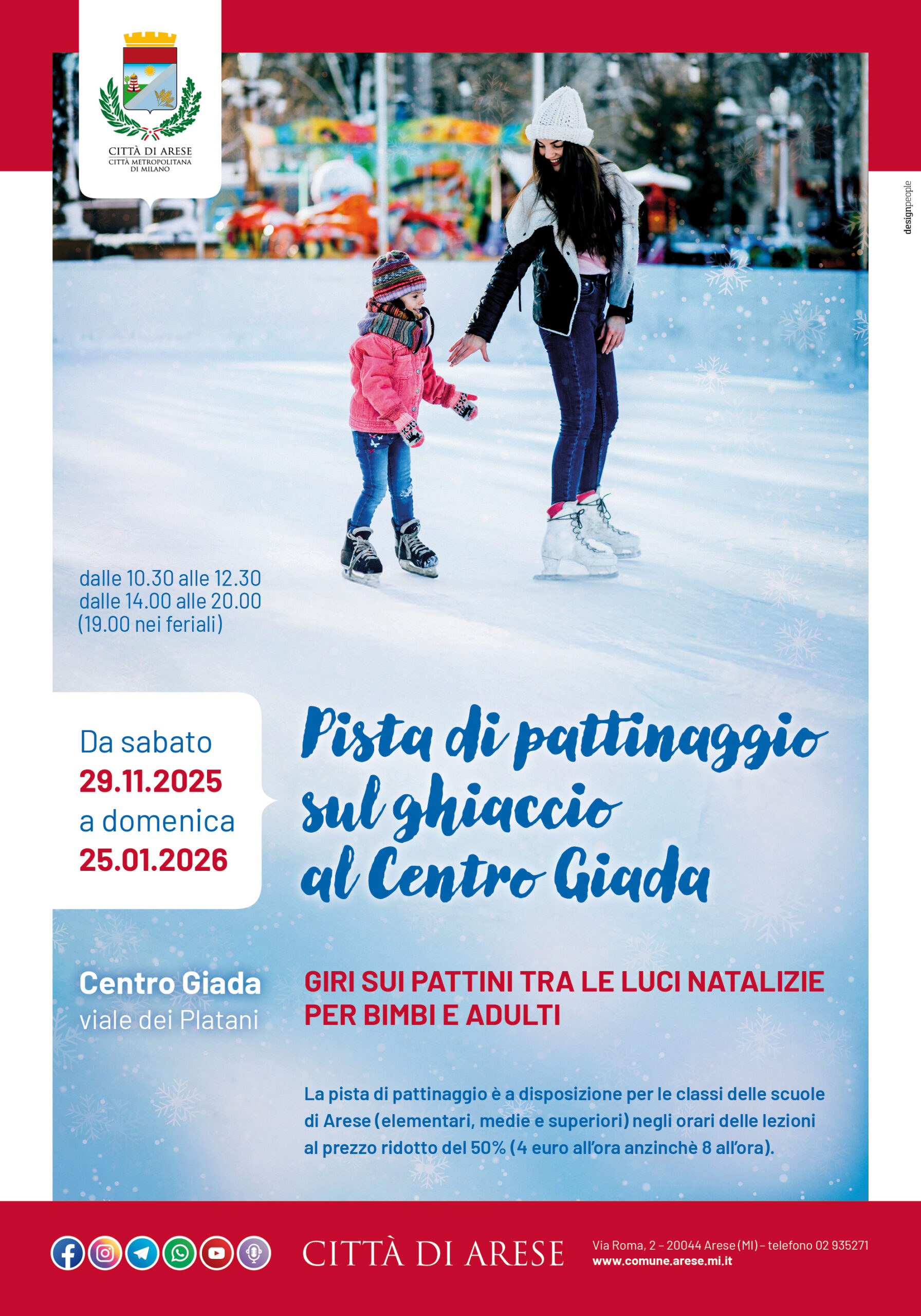 La pista di pattinaggio è a disposizione per le classi delle scuole di Arese (elementari, medie e superiori) negli orari delle lezioni al prezzo ridotto del 50% (4 euro all’ora anziché 8 all’ora).
