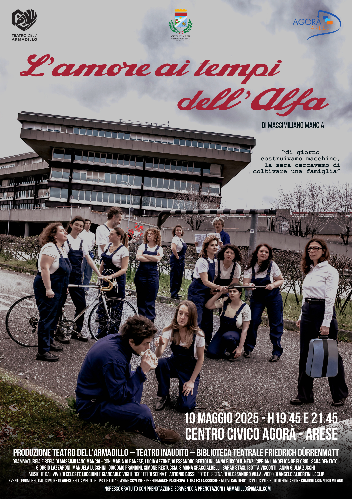 2 – SPETTACOLO “L’AMORE AI TEMPI DELL’ALFA” a cura di Teatro dell’Armadillo, soggetto e regia di Massimiliano Mancia. Mercoledì 30 aprile, evento civico in occasione della Festa dei Lavoratori, alle ore 21.00 al Teatro Civico Roberto De Silva di Rho.