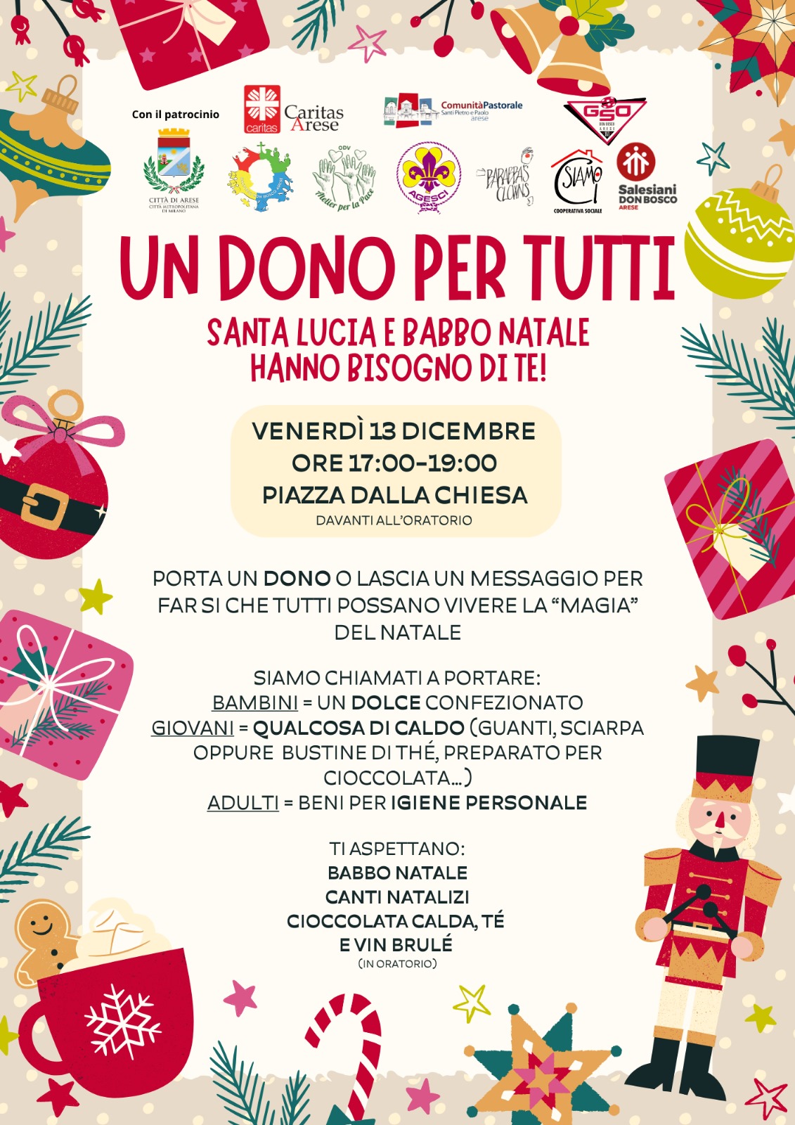 Venerdì 13 dicembre 2024, dalle 17.00 alle 19.00 in piazza C.A. Dalla Chiesa (davanti all’oratorio) porta un dono o lascia un messaggio per far sì che tutti possano vivere la “magia” del Natale.
